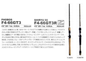 | 4 | F4-66GT3R | SHIRYU 66 | 6'6" | REGULAR | 3/8 - 1oz. | EVA-Split | 8-22lb. | 39,800¥ |